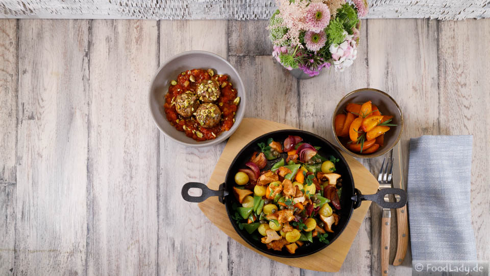 Ein „Gröstl“ in bester Gesellschaft stellt sich vor. Das Pfännchen ausnahmsweise ohne Spiegelei, stattdessen steuern saftige Hühnchen-Linsen-Bällchen den Eiweiß-Anteil bei. Pikanter Tomatensugo befeuert Geschmacksknospen und Stoffwechsel. Das Pilz-Gemüsepfännchen würde auch ohne Bällchen durchgehen und als Eiweißspender könnten Kräuterquark oder würzig gepimpter Joghurt einen passablen Begleiter mimen. Doch die „Polpette di Pollo con Sugo“ passen hervorragend zu der Kombination aus Kartoffeln, Bohnen und Pfifferlingen. Sugo aus reifen Gartentomaten ist gesund, nachhaltig und geht sowieso immer und zu allem. Als weitere, willkommene Gesellschaft für das „Gröstl“ gesellt sich Aprikosen-Kompott, in Südtirol und Österreich „Marillen-Röster“, dazu. Die Kombination von Deftigem, Tomatigem und Süßem ist himmlisch !🙏