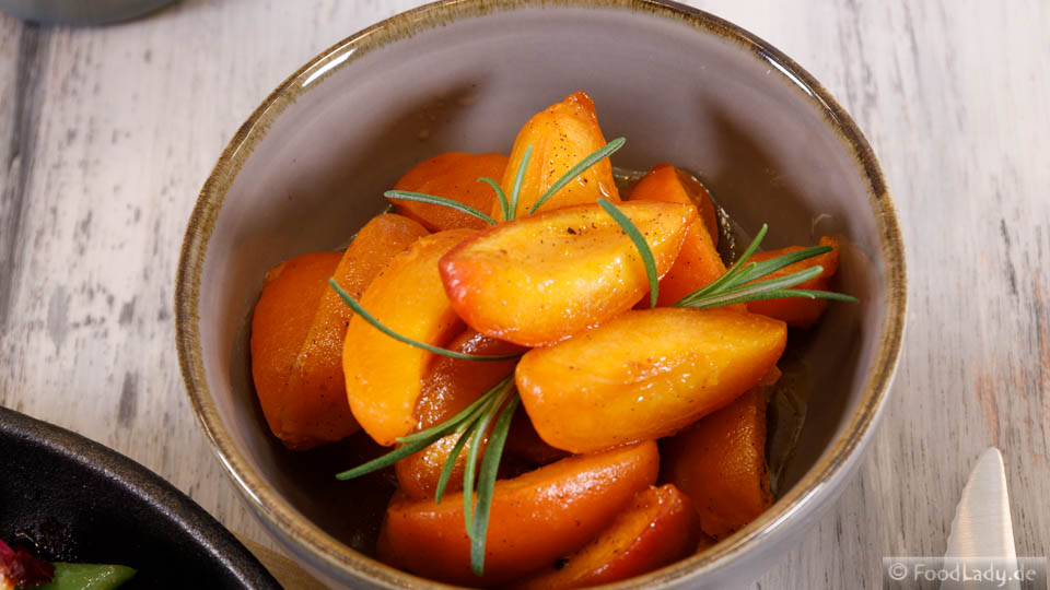 Die Aprikosen (in Österreich und Südtirol heißen sie Marillen) entsteinen und in Achtel schneiden. Zucker, Honig und Olivenöl karamellisieren. Früchte einlegen, mit einigen Spritzern Zitronensaft und einem kleinen Schluck Wasser sowie der Vanillestange, Sternanis und der Chilischote für ca. 15 Minuten köcheln lassen. Wer die Früchte lieber zerfallen lässt, verlängert die Garzeit nach Gusto. Topf beiseite ziehen, die Rosmarinzweige einlegen und für einige Stunden durchziehen und abkühlen lassen. Rosmarin, Vanillestange und Sternanis entnehmen. Vanillestange gründlich abwaschen und weiterverwenden, z. B. für Vanillezucker oder Vanillesalz. Sternanis ebenfalls abwaschen und für ein Kompott oder ein Sugo (s. o.) weiterverwenden.