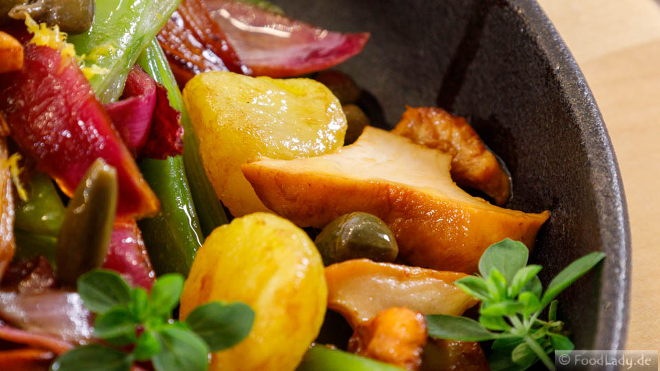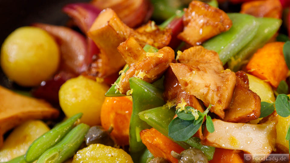 Pfifferlinge in 1 EL Nussbutter und 1 EL Olivenöl rasch anbraten. In die Pfanne zu dem Gemüse geben. Alles gut durchschwenken.