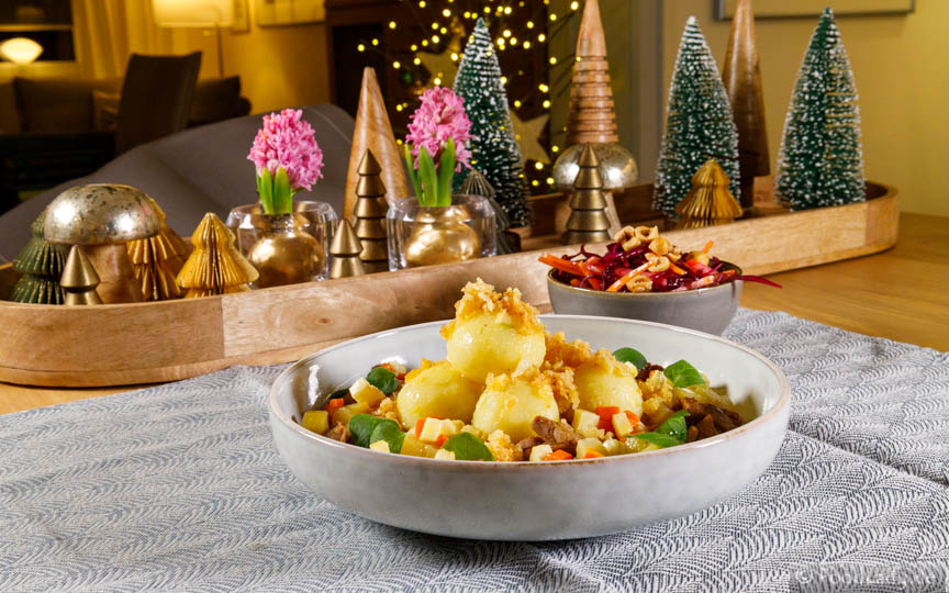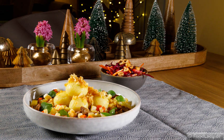 Dem klassischen Ragù kann man einen Extra-Dreh verleihen, indem man Wildfleisch mitverwendet, aber auch Gans oder Ente. Ich entscheide mich heute für die Ente. Mein Ragù entsteht zunächst wie eine klassische Bolognese-Sauce durch ausgiebiges, gemütliches Schmurgeln von Gemüse und Hack. Zusätzliches Keulenfleisch, im Sous-Vide-Bad unvergleichlich zart gegart, bringt den ultimativen Geschmack von Ente auf die Zunge. Raffinesse und fruchtige Frische verleiht meinem Ragù die Quitte. Sie steuert eine leicht herbe Fruchtsäure bei und ist nicht zu weich gegart. Ihre Rolle spielt sie zurückhaltend und unterstützend, statt auftrumpfend in den Vordergrund zu treten. Der Rotkohl gesellt sich nicht klassisch als Gemüse zur Ente, sondern als erfrischender Salat. Er bleibt roh, ohne jedoch wie Rohkost anzumuten, denn Kneten mit leichtem Druck macht ihn „gefügig“. Apfel und Möhre vertreiben jeden Anflug von Dumpfheit und geröstete Piemonteser Haselnüsse verleihen dem winterlichen Kohl Klasse. Edle Begleitung sind fluffige Kartoffelklößchen „Schneebällchen“, die man als regionales Pendant von „Gnocchi“ bezeichnen könnte.