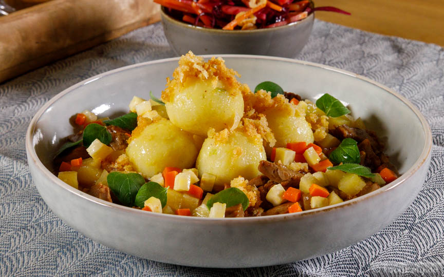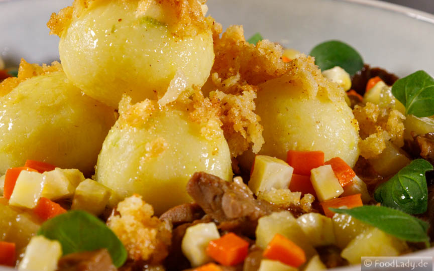 Für die Klößchen die Kartoffeln durch die Presse drücken. Den Lauch sehr fein schneiden. Die Kartoffeln mit Eigelben, Voll-Ei, Lauch, Zitronenabrieb, Grieß, Stärke und Semmelbröseln (nach Bedarf) sowie Salz, Pfeffer und Muskat mischen. Dabei nicht zu lange vermengen und die Masse nicht stark kneten. Am besten einen Teigspatel verwenden, damit die Masse nicht klebrig und somit zu fest wird. Unbedingt einen Probekloß garen. Zerfällt der Teig, noch etwas Stärke einarbeiten. Gleichmäßige, kleine Klößchen formen. Zum Rollen die Hände feucht halten, so werden die Klößchen glatter. Ausreichend Wasser mit Salz und Stärke aufkochen. Die Stärke legt sich wie ein dünner Film um die Klößchen und macht sie glatt und glänzend. Die Klößchen sieden (nicht kochen!), bis sie an die Oberfläche steigen. 5 Minuten ziehen lassen.