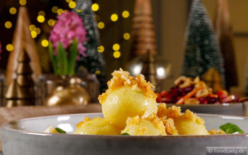 Butter schmelzen, aufschäumen, Panko-Brösel darin leicht bräunen. Zum Servieren die Klößchen damit beträufeln.