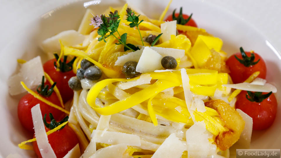 Die Zitronenschale aus der Butter entfernen. Butter erhitzen. Zitronensaft nach Geschmack und reichlich Zitronenzesten sowie die fein gehackte Salz-Zitrone hinzufügen. Zoodles einlegen. Die Linguine bis kurz vor al dente garen. Tropfnass in den Topf mit den Zoodles geben. Kapern und Oliven unterheben. Auf einem vorgewärmten Teller anrichten. Großzügig Scamorza darüber hobeln.
