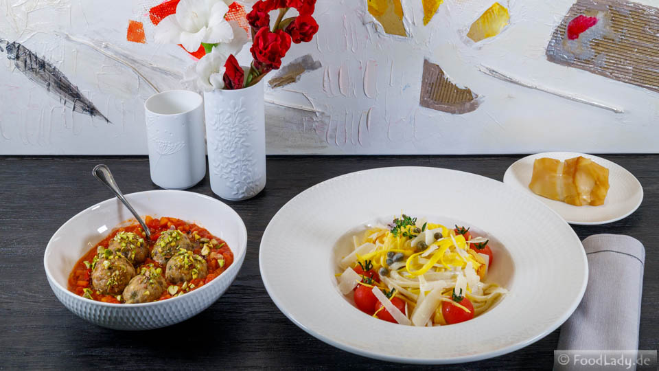 Im Sinne des passenden Namens für ein Gericht konsultiere ich Speisekarten im Restaurant aufmerksam. Es ist mir zur Gewohnheit geworden, doch wird mir häufig vor Augen geführt, wie für mich der Weg nicht aussehen kann. Karten, die Zutaten in Reihe aufzählen, lassen den Gast zwar nicht im Unklaren über das Wesentliche, nämlich das, was auf den Teller kommt. Doch das Weitere bleibt der Fantasie überlassen. Mein heutiges Rezept würde möglicherweise wie folgt annonciert: „Pasta | Limone | Polpette | Sugo | Scamorza“. Das kann man so machen, doch ich finde solche Titel mit „Trennbalken“ unpersönlich. Stylish kommen sie daher, keine Frage. Mein Geschmack ist es nicht. Ich mag bei allem, was ich mache, etwas mehr Empathie und Zuwendung.